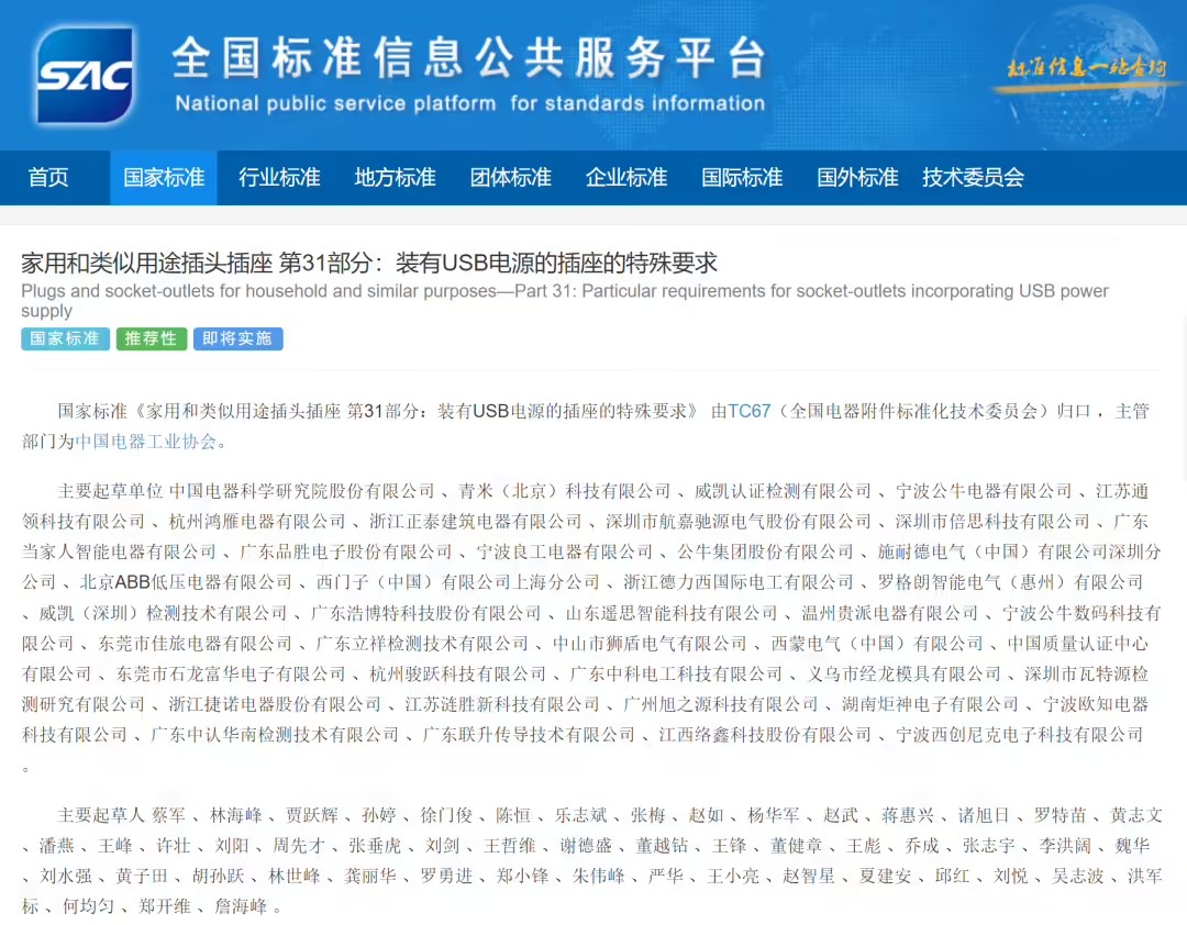 IT之家 5 月 18 日消息,國家市場監(jiān)督管理總局(國家標(biāo)準(zhǔn)化管理委員會)4 月 25 日批準(zhǔn)《家用和類似用途插頭插座 第 31 部分:裝有 USB 電源的插座的特殊要求》等 295 項推薦性國家標(biāo)準(zhǔn)和 2 項推薦性國家標(biāo)準(zhǔn)修改單。其中,USB 電源插座新規(guī)將在 2025 年 11 月 1 日實施。